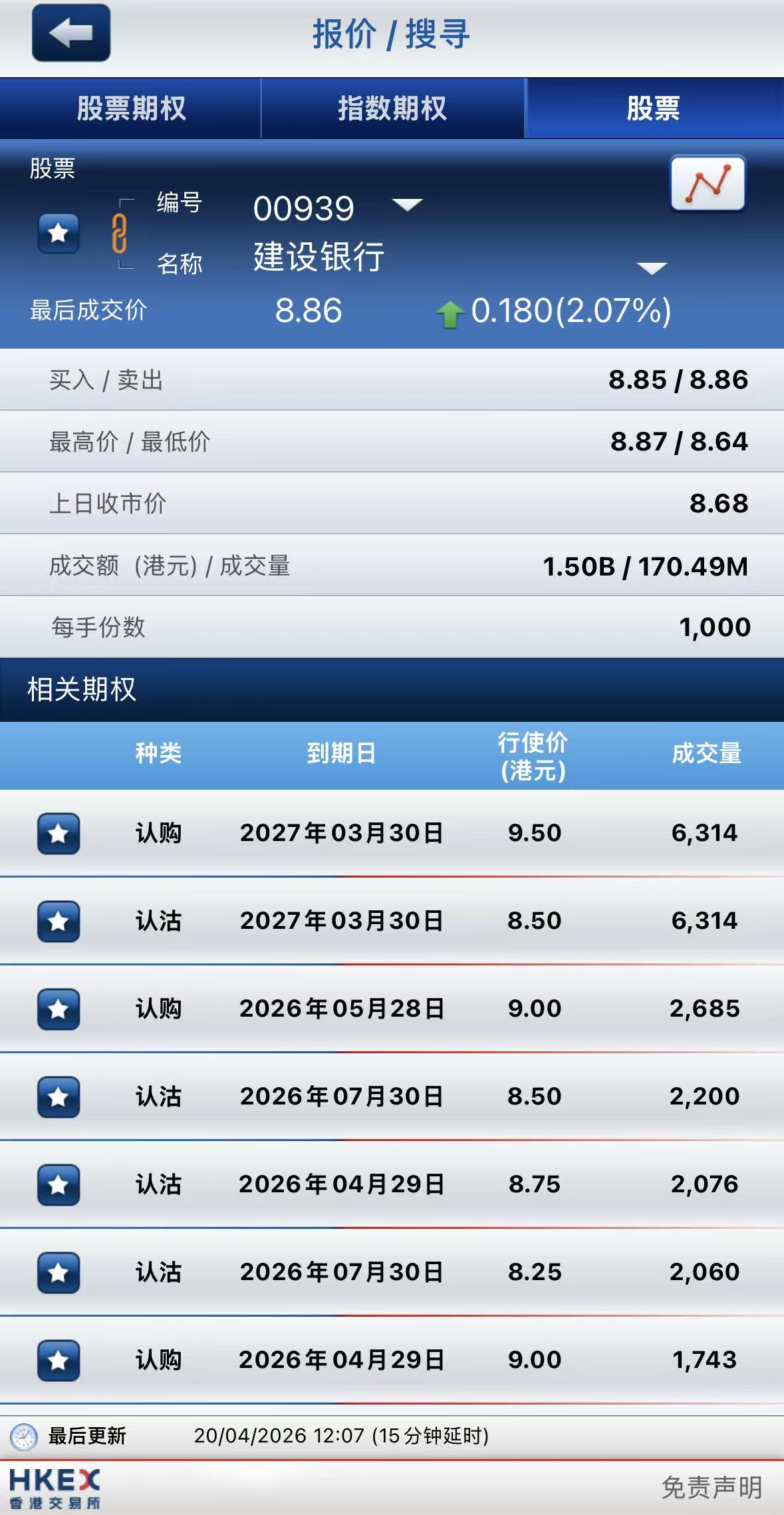 期权方面,建设银行半日成交近3.5万张,其中于2027年3月30日到期行使价分别位9.5港元认购期权、8.5港元的认沽期权成交居前,均成交6314张。
