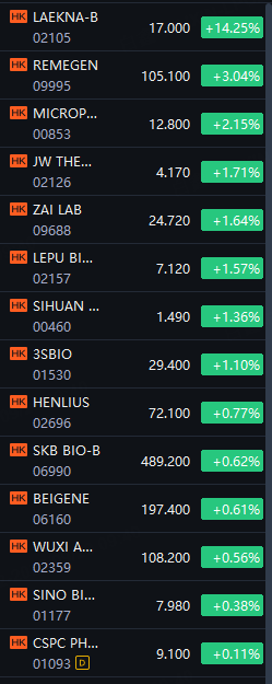 Hong Kong’s biotech stocks rose. Laekna up 14%; RemeGen rose 3%; Microport up 2%; JW Therap, Zai Lab and Lepu up 1%.