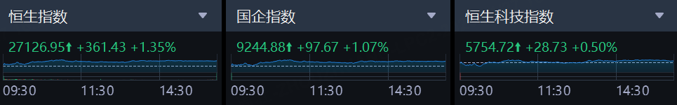 在权重金融与部分成长板块的带动下,港股延续反弹。收盘时,恒生指数涨1.35%,报27126.95点;国企指数涨1.07%,报9244.88点;恒生科技指数涨0.50%,报5754.72点。盘中矿业、半导体、AI应用等方向表现突出,风险偏好回升。全天成交额约2543.73亿港元,较此前有所放大,反映资金参与度改善。