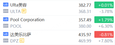 11月15日,美股夜盘时段,获巴菲特建仓,达美乐比萨涨近8%、Pool涨超6%;Ulta美容跌超4%,遭伯克希尔Q3大幅减持。