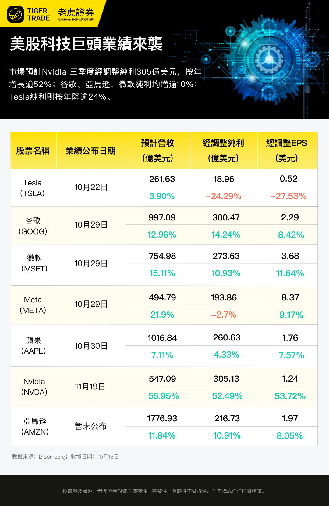隨著第三季度財報季拉開序幕,市場目光聚焦於即將公布業績的美股科技巨頭。根據Bloomberg數據,本季度科技板塊表現呈現明顯分化——Nvidia( 英伟达 )預計將以超過50%的純利增長率一馬當先,而Tesla( 特斯拉 )則可能純利大幅下滑。