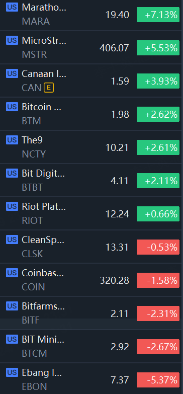 Crypto stocks mixed in morning trading. Marathon Digital rose 7%; MicroStrategy rose 6%; Canaan rose 4%; while Coinbase and Bitfarms fell 2%.