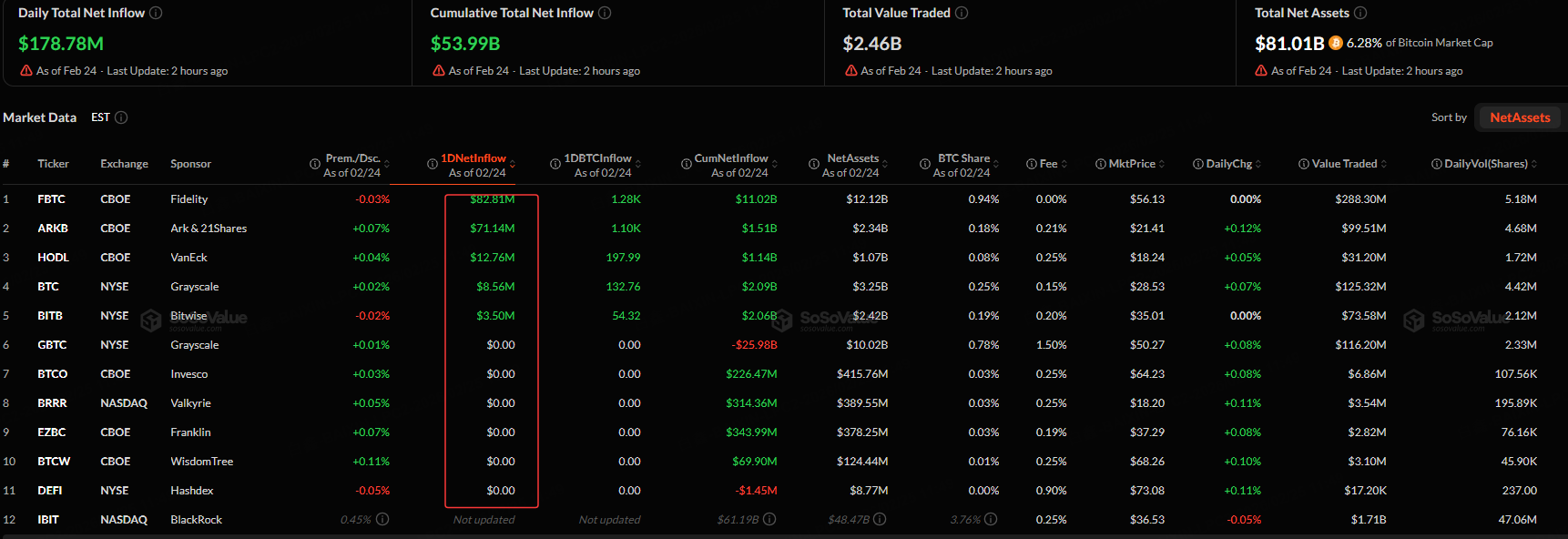 The Bitcoin spot ETF with the highest net inflow on February 24 was Fidelity Wise Origin Bitcoin Fund , with a net inflow of $82.81 million, according to SoSoValue.