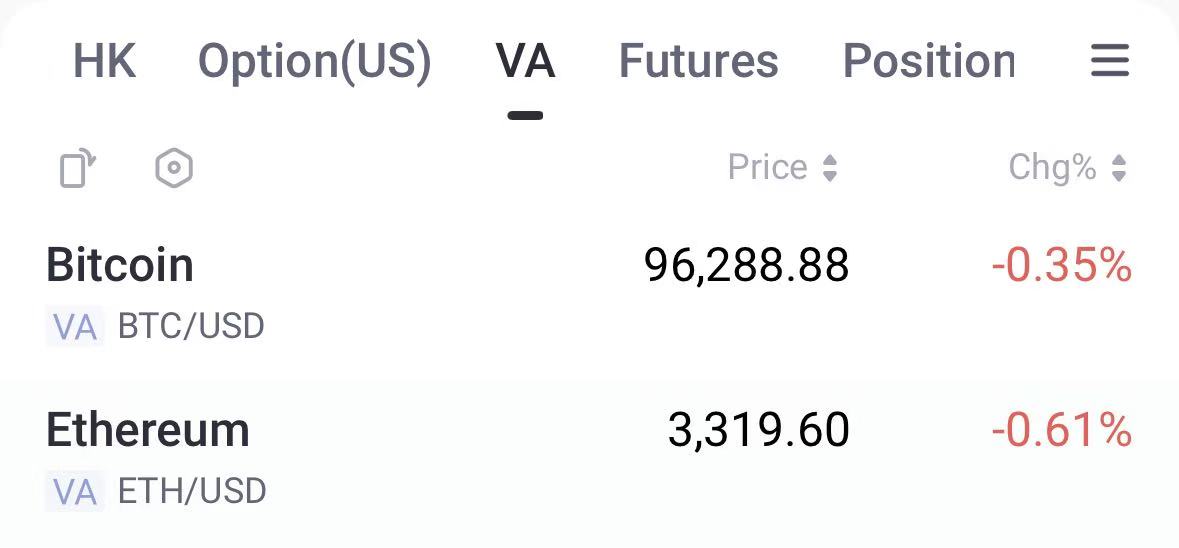 Tiger Trade行情显示,BTC收复96000 美元,现报96288美元,24H降幅0.35%.;Tiger Trade行情显示,ETH险守3300美元,现报3319美元/枚,日内降幅0.61%。