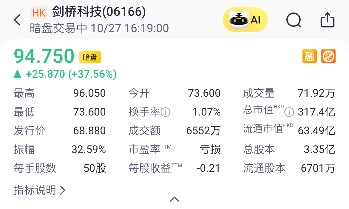 剑桥科技暗盘大涨37%,一手账面赚超1200港元。