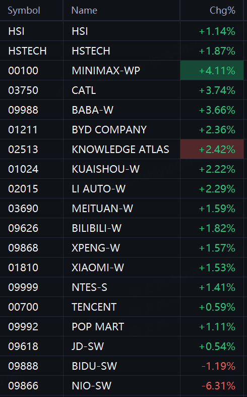 In terms of star stocks, MiniMax, CATL, and Alibaba rose 4%; Knowledge Atlas, BYD, Kuaishou, Li Auto, Bilibili, Meituan, XPeng, and Xiaomi rose 2%; NetEase and Pop Mart rose 1%; while Baidu fell 1%; NIO fell 6%.