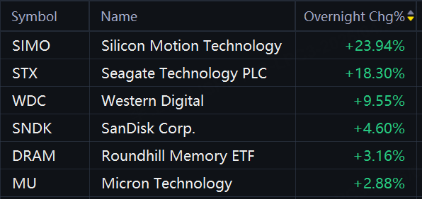 Shares of storage companies jumped in overnight trading, after strong revenue and profit forecasts from Seagate Technology signaled that spending by enterprises on artificial intelligence equipment will remain strong. Silicon Motion Technology soared 23.9% after earnings; Seagate Technology surged 18.3% after earnings; Western Digital jumped 9.6%; SanDisk gained 4.6%; Roundhill Memory ETF and Micron Technology rose about 3%.