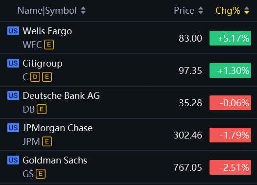 Bank stocks mixed after earnings results. Wells Fargo up 5%; Citigroup up 1%; Goldman Sachs down 2.5%; JPM down 1.8%