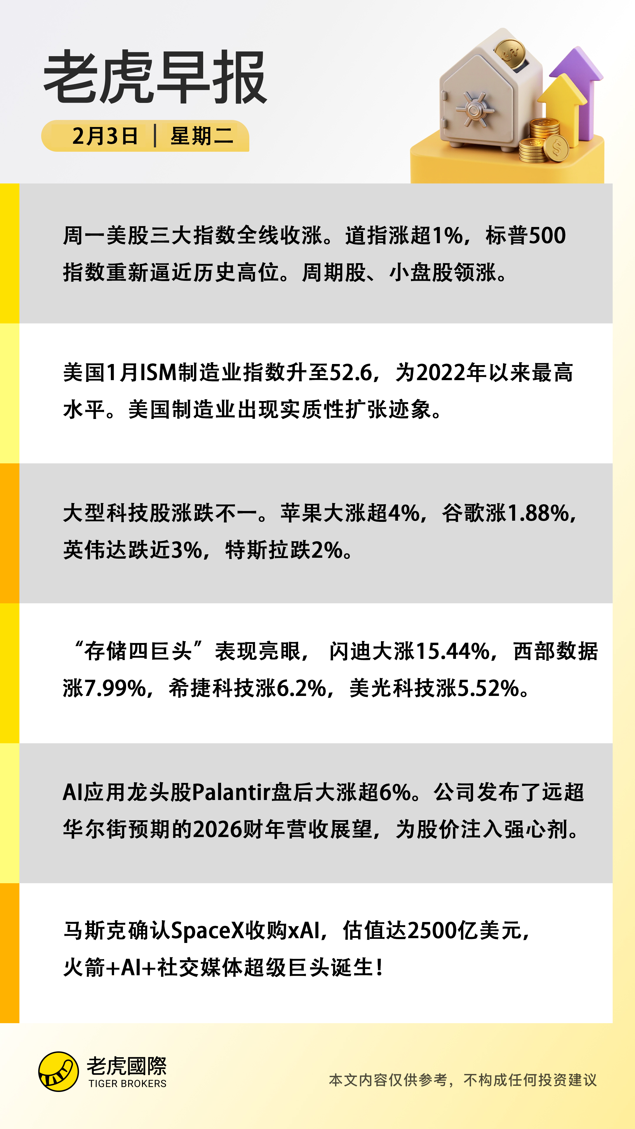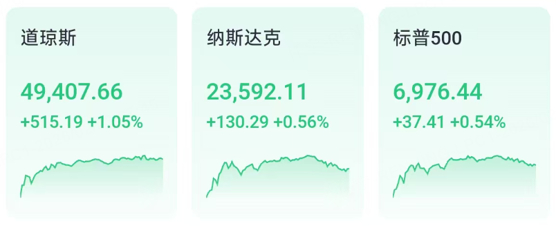 2月2日周一,随着贵金属和加密货币市场的抛售风暴缓和,美股市场整体表现平稳。好于预期的PMI数据也助推三大指数低开后走高,并悉数收涨。截至收盘,标普500指数涨0.54%,报6976.44点;纳斯达克综合指数涨0.56%,报23592.11点;道琼斯工业平均指数涨1.05%,报49407.66点。