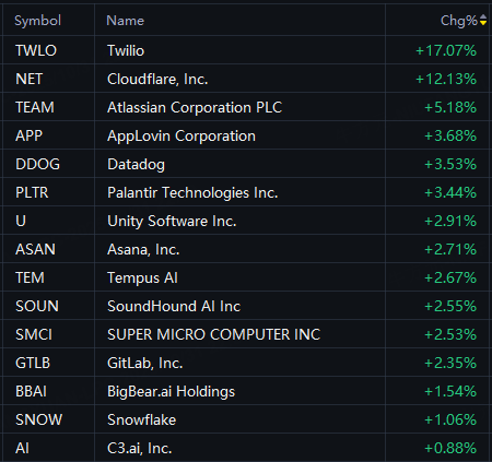 AI application software shares jumped in Friday trading. Twilio up 17%; Cloudflare up 12%; Atlassian up 5%; AppLovin, Datadog up 4%; Palantir, Unity, SoundHound AI up 3%.