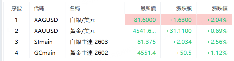 黄金主连 2602 向上突破4550美元/盎司,日内涨超1%; 白银主连 2603 向上突破81美元/盎司,日内涨超2.5%。
