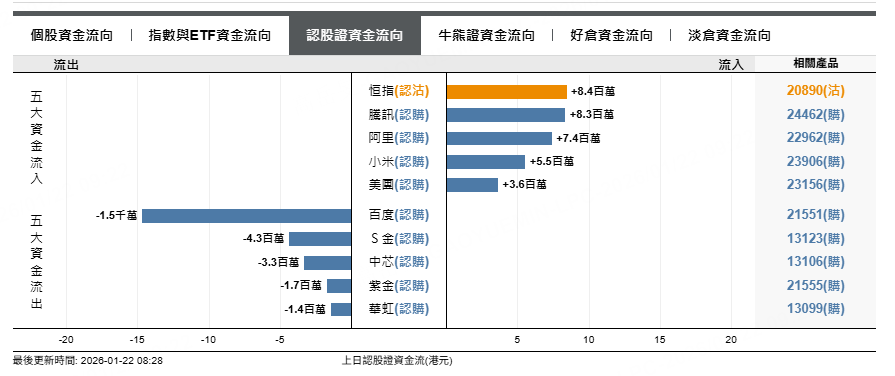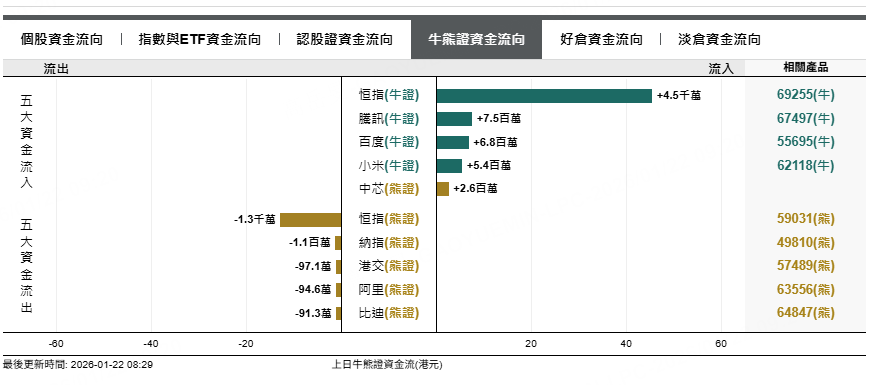 恒指熊證上日流出1300萬元,納指熊證上日流出110萬元,港交熊證流出97萬元。