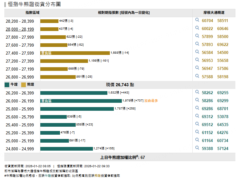 恒指上日在26500點水平上落 觀察好淡友部署反映上日輪場投資者傾向追入好倉 恒指牛 恒指摩通八乙牛F.C /熊 恒指摩通八乙熊G.P