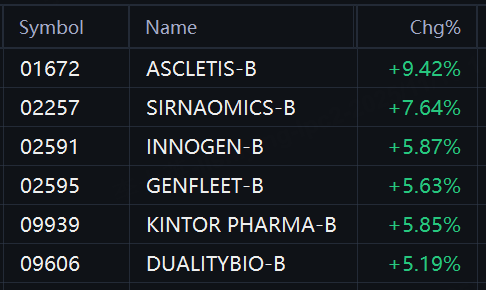 Biomedical stocks jumped in Hong Kong this afternoon. Ascletis Pharma rose 9% ; Sirnaomics rose 8%; Innogen, Kintor Pharmaceutical, and GenFleet rose 6%; Duality Biotherapeutics rose 5%.