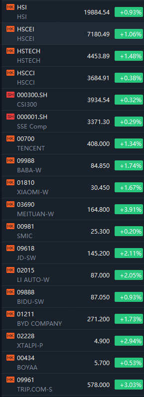 On December 18, 2024, the Hong Kong stock market opened broadly higher. The Hang Seng Index rose 0.93%, the National Enterprise Index rose 1.06%, the Hang Seng Technology Index rose 1.48%, and the Red Chip Index rose 0.38%.