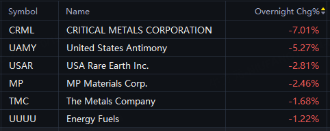 24H|Rare Earth Stocks Drop, Critical Metals down 7%, United States Antimony down 5%, MP Materials down 2%; Stellantis up 7%