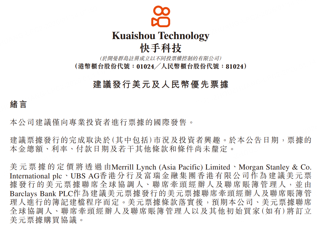 快手发布公告,公司建议仅向专业投资者进行票据的国际发售。美元票据的定价将透过由Merrill Lynch (Asia Pacific) Limited、Morgan Stanley & Co. International plc、UBS AG香港分行及富瑞金融集团香港有限公司作为建议美元票据发行的美元票据联席全球协调人、联席牵头经办人及联席账簿管理人,并由Barclays Bank PLC作为建议美元票据发行的美元票据联席牵头经办人及联席账簿管理人进行的簿记建档程序而定。美元票据条款落实后,预期公司、美元票据联席全球协调人、联席牵头经办人及联席账簿管理人以及其他初始买家(如有)将订立美元票据购买协议。