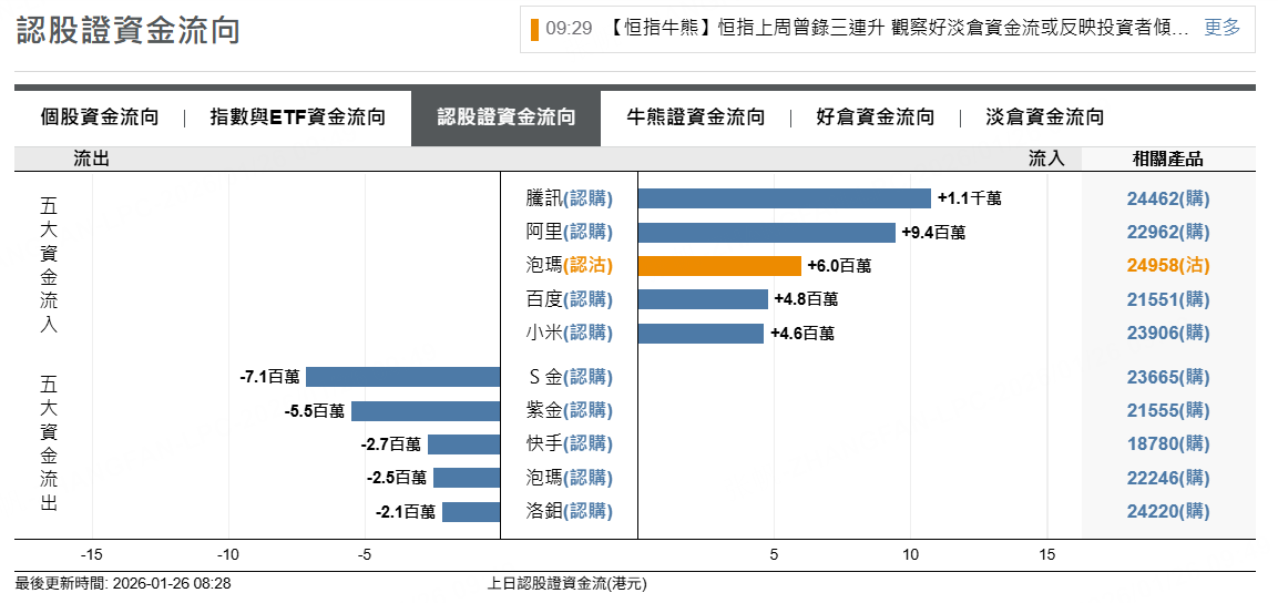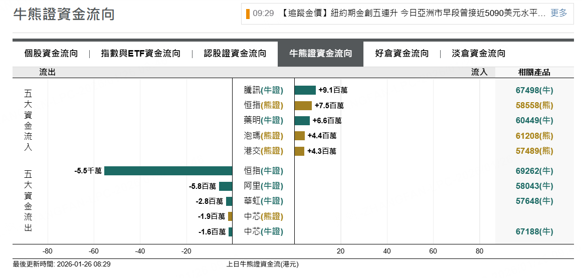 騰訊牛証流入910萬元,恒指熊證上日流入750萬元,藥明牛證流入660萬元。