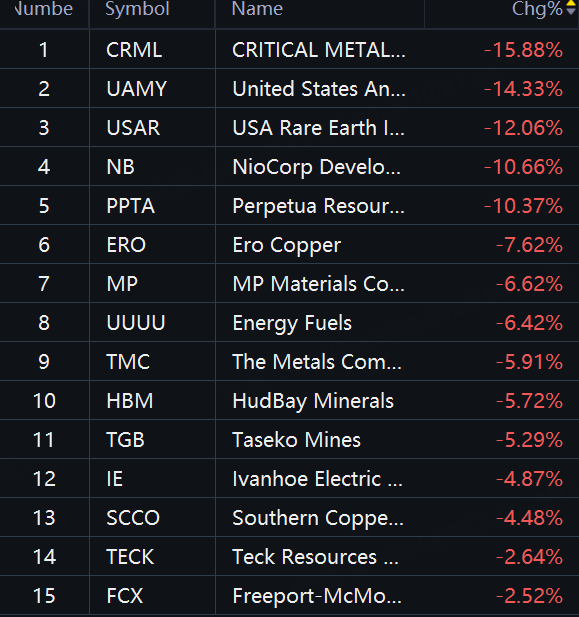Rare earth stocks sink. Critical Metals down 16%; UAMY down 14%; USA Rare Earth down 12%; NioCorp and Perpetua down 10%.