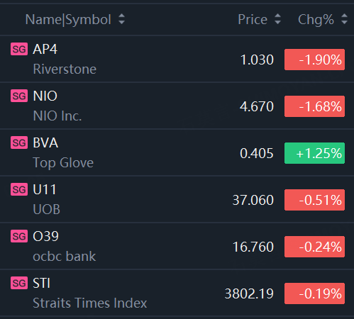 Singapore stocks opened lower on Friday. STI fell 0.19%; Riverstone fell 1.9%; NIO fell 1.7%; Top Glove rose 1.25%.