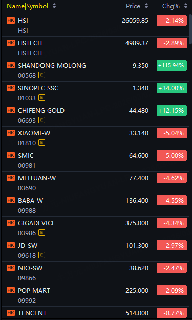In terms of star stocks, Shandong Molong up 116%; Sinopec SSC up 34%; Chifeng gold up 12%; Alibaba, Xiaomi, SMIC, Meituan down 5%; Tencent down 1%.