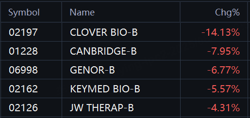 Biotechnology stocks fell in Hong Kong in the afternoon, with Clover Biopharmaceuticals dropping more than 14%. Canbridge Pharmaceuticals fell nearly 8%, while Genor Biopharma dropped nearly 7%. Keymed Biosciences fell 6%, JW (Cayman) Therapeutics fell 4%.