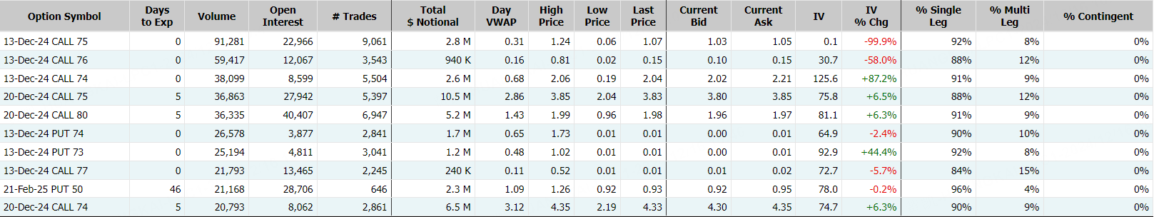 上周五(12月13日),Palantir收高3.92%。纳指成分股调整公布!热门股Palantir被纳入。Palantir期权合约成交96.07万张,较90日均量放大1.7倍,其中看涨期权占比超52%。当日(12月13日)到期的75美元的行权看涨期权交易量特别高,共有91,281份合约交易。