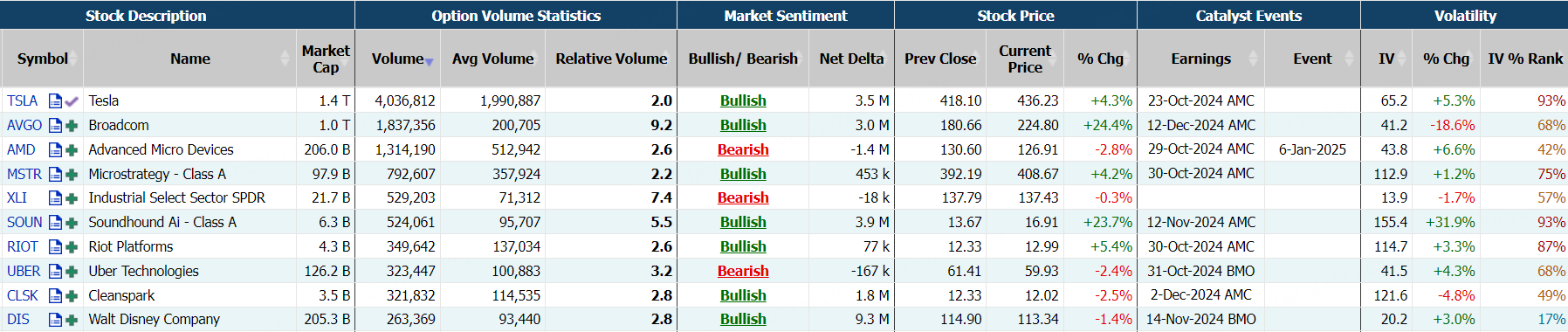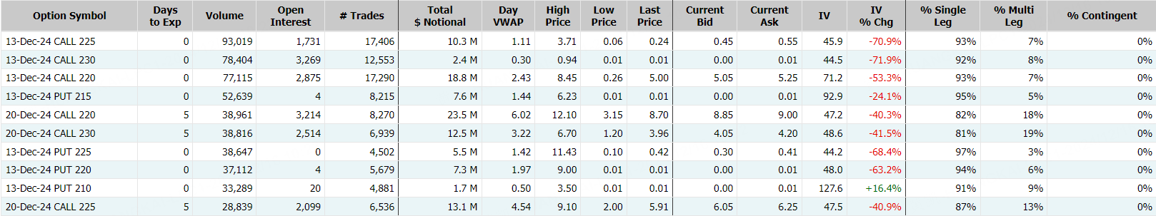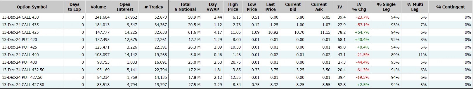 特斯拉期权合约成交405万张,较90日均量放大2倍,其中看涨期权占比超59%。当日(12月13日)到期的430美元的行权看涨期权交易量特别高,共有241,604份合约交易。