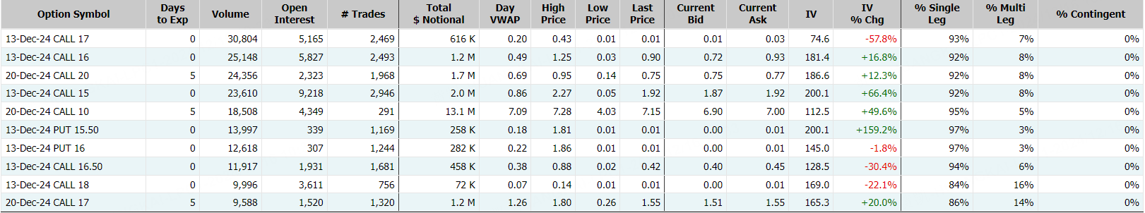 人工智能软件公司SoundHound收高23.7%,该股今年迄今已上涨约700%。SoundHound期权合约成交52.41万张,较90日均量放大5.5倍,其中看涨期权占比超72%。当日(12月13日)到期的17美元的行权看涨期权交易量特别高,共有30,804份合约交易。
