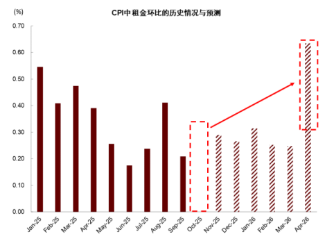 美国房租通胀使用6个样本轮换统计通胀增速,每月通胀环比约等于当月样本相对6个月之前样本的累计变化除以6。求出单月环比后,再把环比增速累乘算出同比增速。由于统计局直接使用4月数据填充10月数据,导致算出的10月通胀环比为0。环比增速累乘得出的11月通胀同比漏记了10月通胀环比变化,因此出现严重低估。但在26年4月,当统计局使用26年4月相对25年10月样本的房租价格变化推算通胀环比时,由于25年10月读数实际是25年4月读数,相当于使用过去12个月的通胀累计变化除以6来计算4月房租通胀环比,会导致2026年4月房租通胀环比增速翻倍,对10月-11月通胀低估进行补偿,我们估测对总体CPI的补偿幅度在10bp左右(图表2)。