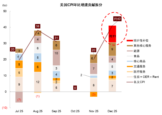 “政府关门”导致11月CPI数据统计集中在11月下旬进行,恰逢美国感恩节打折季,可能让大量商品通胀被低估。由于这些商品大量采取隔月统计方式,因此并不只在2025年12月进行补偿,也有一部分会在2026年1月进行补偿。具体来讲,26年1月时,隔月统计样本使用25年11月至26年1月之间的物价变化计算通胀。由于11月数据被低估,因此2026年1月通胀会被相应高估。我们估测2025年12月与2026年1月这两个月的补偿幅度在5bp左右。