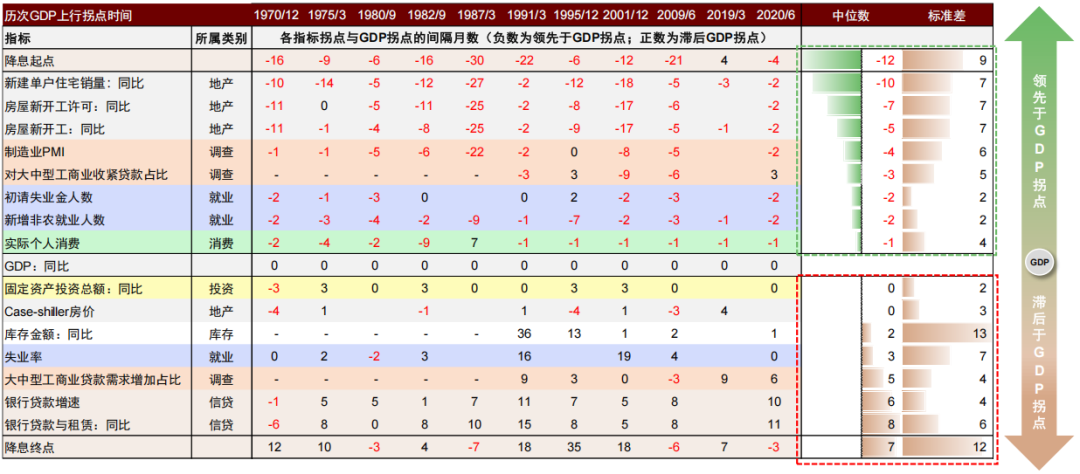 *注:图中的数字为历次降息推动的增长周期拐点中,各项指标拐点与GDP同比的上行拐点之间间隔的月份数,负数代表指标拐点出现在GDP同比的拐点之前,正数代表指标拐点出现在GDP同比的拐点之后;我们将各项指标从上到下按照相对GDP拐点“领先-滞后”的顺序依次排列