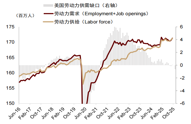 近期通胀上行主要受到特朗普关税与移民政策影响:关税改变进口产品价格,而通胀是物价变化率,因此关税对通胀只有阶段性影响。从2025年4月起到2026年6月,长达一年之久,物价对关税的调整可能已经比较充分。移民虽然减少劳动力供给,但劳动力需求也同步减少(图表8),也不会形成通胀压力。如果美国最高法院推翻特朗普“对等关税”,可能让通胀上行幅度更小,持续时间更短,我们建议密切关注。