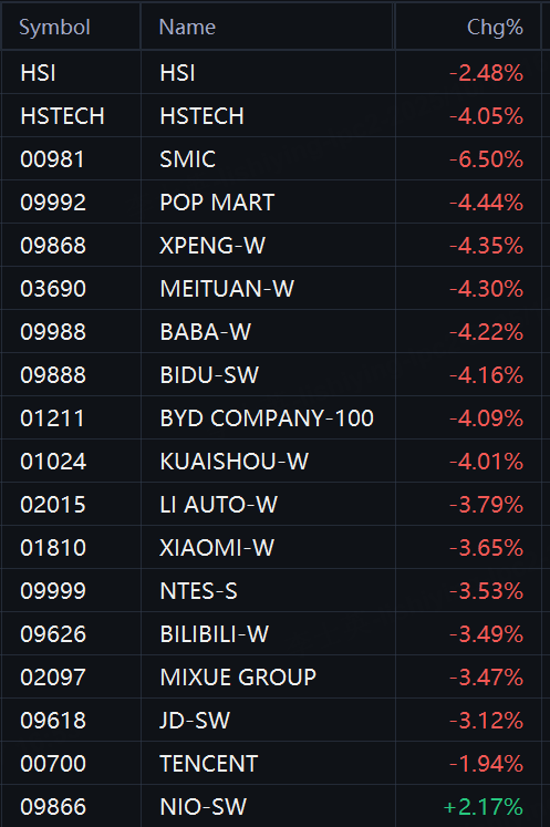In terms of star stocks, SMIC fell 7%; Pop Mart, XPeng, Meituan, Alibaba, Baidu, BYD, Kuaishou, Li Auto, Xiaomi, NetEase, Bilibil, and Mixue Group fell 4%; JD.com fell 3%; Tencnet fell 2%; while NIO rose 2%.