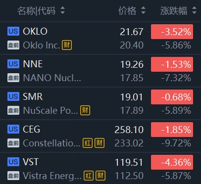 11月4日,美股核电概念股盘前集体重挫!Talen Energy跌超14%,Constellation Energy跌近10%,Nano Nuclear Energy跌超7%,OkloNuScale PowerVistra Energy Corp跌超5%。