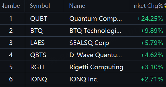 Quantum Stocks Rally. Quantum Computing up 24%; BTQ up 10%; Sealsq up 6%; D-Wave Quantum up 5%; IONQ and Rigetti up 3%.
