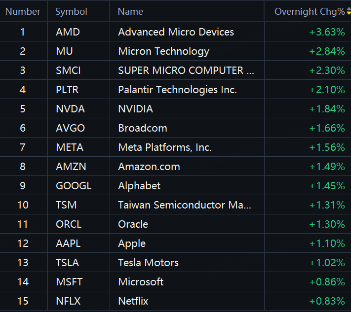 Big tech stocks jumped in overnight trading. AMD up nearly 4%; Micron up nearly 3%; SMCI, Palantir, Nvidia up around 2%.