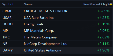 Rare earth stocks rose in premarket trading on Thursday. Critical Metals rose 9%; USA Rare Earth rose 4%; MP Materials, Energy Fuels, The Metals Company rose 3%; NioCorp Developments rose 2%.