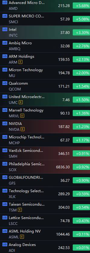 Chip Stocks Shined. AMD and Super Micro rose 5%; Intel rose 3%; Arm and Micron up 2%; Qualcomm, Marvell and Nvidia rose 1%.