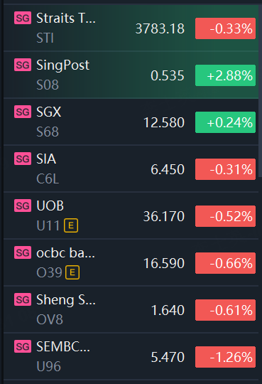 Note: The Singpore stock market will close early at 12:00 p.m. local time on Tuesday.