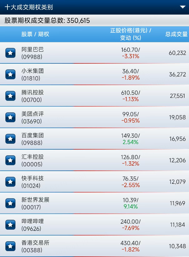 港股上午股票期权成交总量为350615张合约。阿里巴巴期权成交量居个股首位,达60232张合约。小米、腾讯、美团、百度紧随其后。