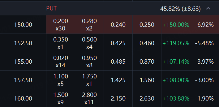 阿里的PUT价格大涨,一张周五到期、行权价150港元的合约,价格暴涨150%。