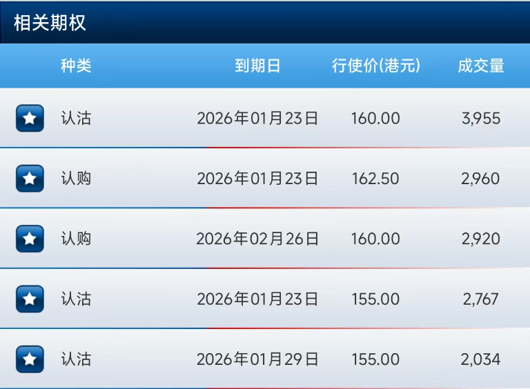 期权方面,阿里排名第一的是一份认沽期权,到期日为本周五,行权价160港元。