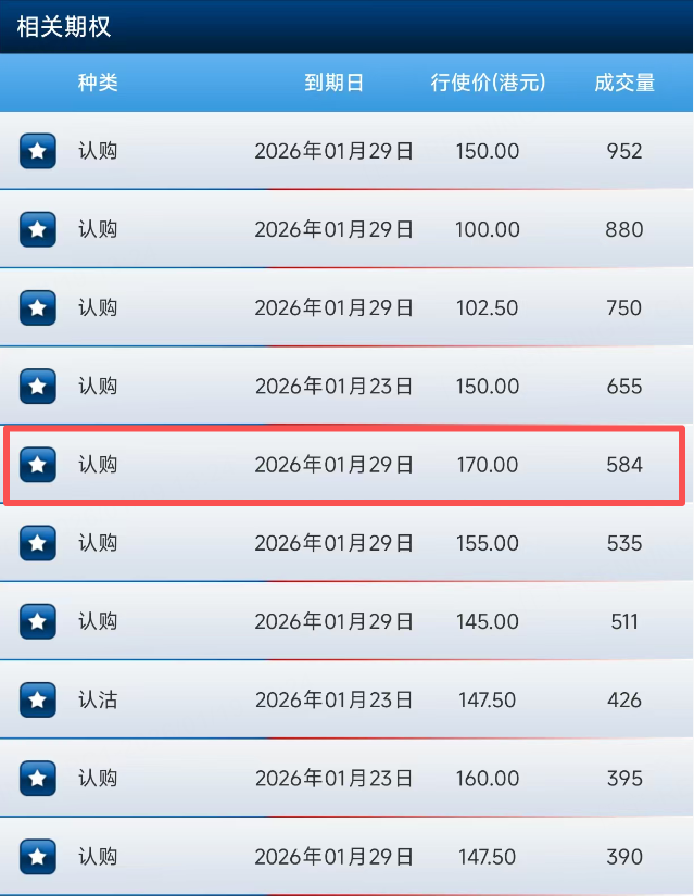百度上午排名前七位的都是认购合约,前十大成交中九张认购合约。其中,最高认购行权价达170港元,到期日为1月29日。