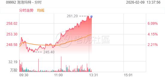 2月9日,港股新消费概念股走高,泡泡玛特涨超7%,老铺黄金、布鲁可涨超5%,小鹏汽车-W、鸣鸣很忙、名创优品涨近3%。