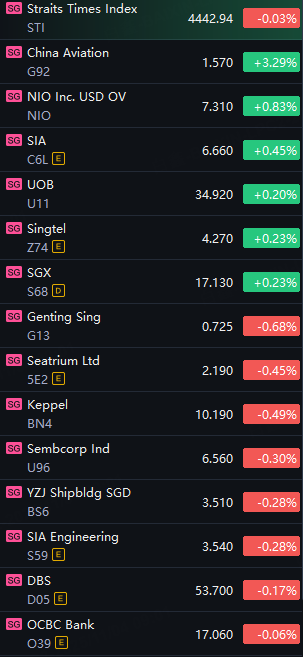 Singapore stocks opened flat on Tuesday. STI was merely changed; China Aviation up 3%.