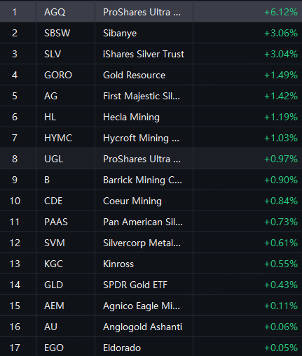 Precious metals stocks gained. AGQ up 6%; SBSW and SLV up 3%.