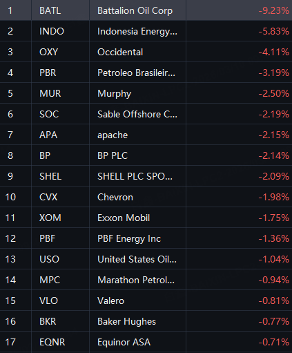 Some Oil Stocks fell. Battalion Oil Down 9%; INDO down 6%; Occidental down 4%.