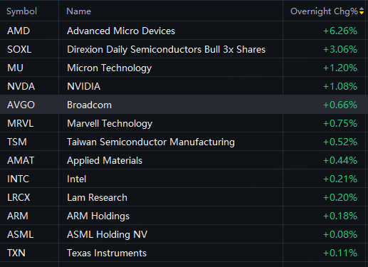 Semiconductor shares rose in overnight trading. AMD up 6%; SOXL up 3%; Micron, Nvidia, Broadcom up 1%.