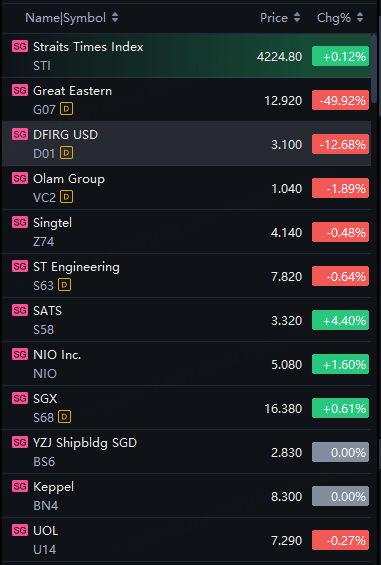 Singapore stocks opened higher on Thursday. STI rose 0.1%; Great Eastern fell 50%; DFI Retail Group fell 13%; SATS up 4%; Nio up 2%.